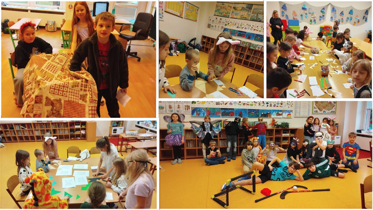 Děti mohly přijít v maskách a vyzkoušet si několik disciplín. Hrály florbal, házely na terč, poznávaly hmatem různé podivnosti nebo skládaly tangramy. Třeťáci vše skvěle organizovali.