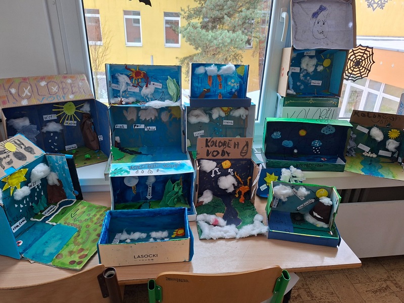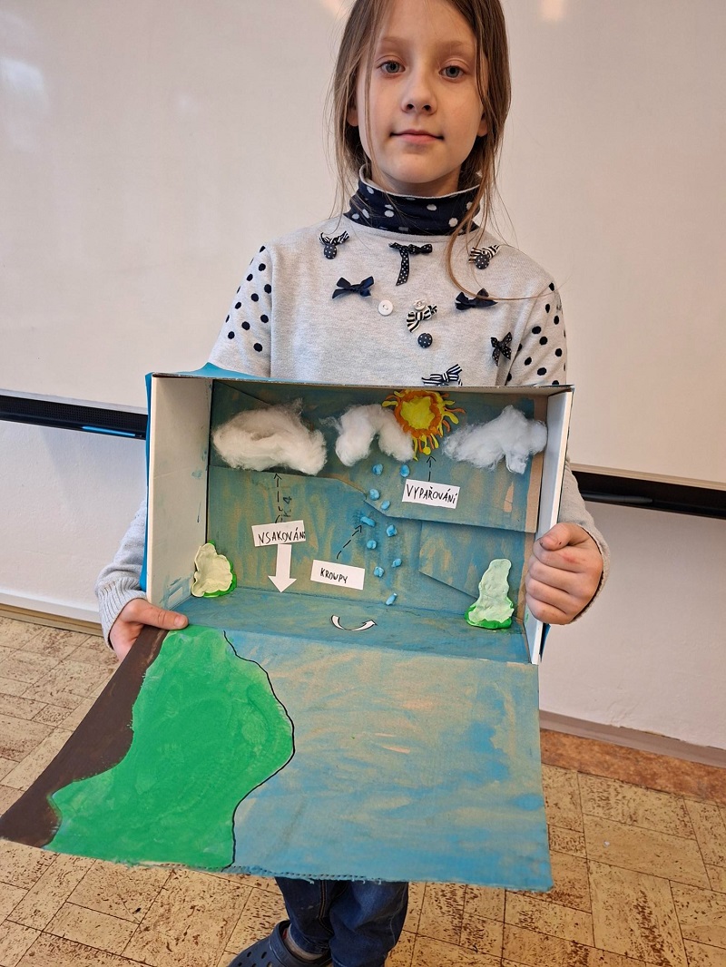 Děti pracovaly s obyčejnou papírovou krabicí, ze které vytvořily originální prostorový model krajiny. Pomocí modelíny, barev, temper, špejlí a papíru znázornily hory, řeky, pevninu i oceány, do nichž umístily počátek koloběhu vody.