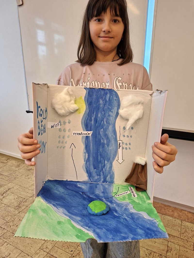 Jednotlivé fáze – vypařování, srážky, vsakování i odtok – doplnily šipkami s vlastními popisky, díky kterému byl celý proces přehledný a srozumitelný. Projekt rozvíjel nejen přírodovědné znalosti dětí, ale také jejich kreativitu, fantazii a manuální dovednosti. Tvoření děti nesmírně bavilo a do práce se zapojily s velkým nadšením. Celý koloběh vody na závěr zakončily prezentací svých projektů před ostatními spolužáky.