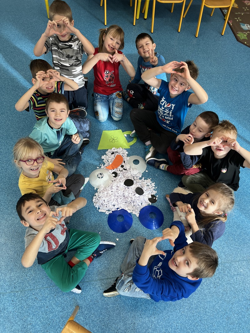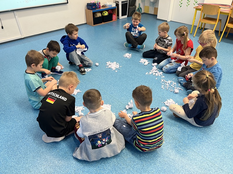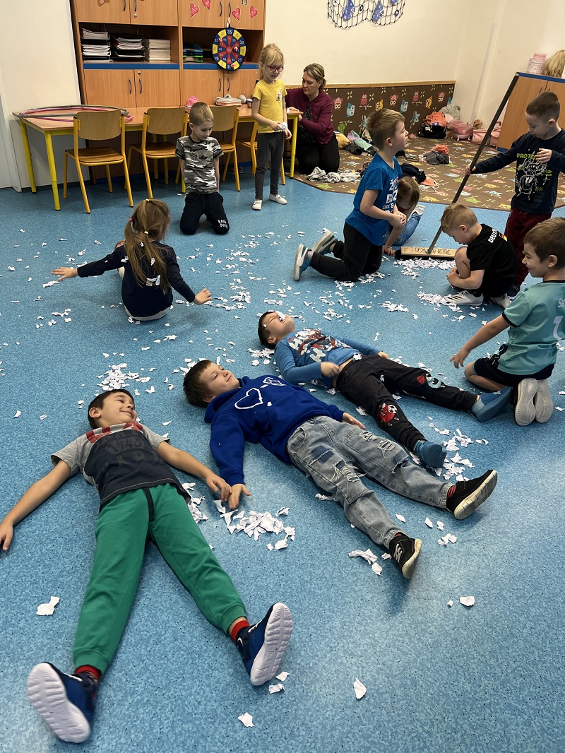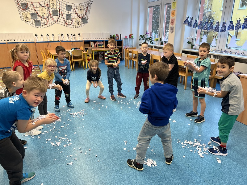 Po vydýchání jsme opět usedli do kruhu a natrhali papír na malé bílé kousíčky. Učíme se spolupracovat, tak jsme, my „rychlíci“, s trháním pomohli pomalejším kamarádům. Před každým z nás byla připravena kupička bílého papírového sněhu. Napjatě jsme čekali na společné vyhození snížku do vzduchu: „Připravit, pozor, teď!“ Mrkněte do fotogalerie, kolik nám to přineslo radosti. Po nasněžení několik z nás spontánně ulehlo do čerstvě napadaného sněhu a kreslilo v něm sněžného andělíčka. A když už u nás tak krásně nasněžilo, nezbývá než postavit sněhuláka. Co myslíte, povedl se nám?