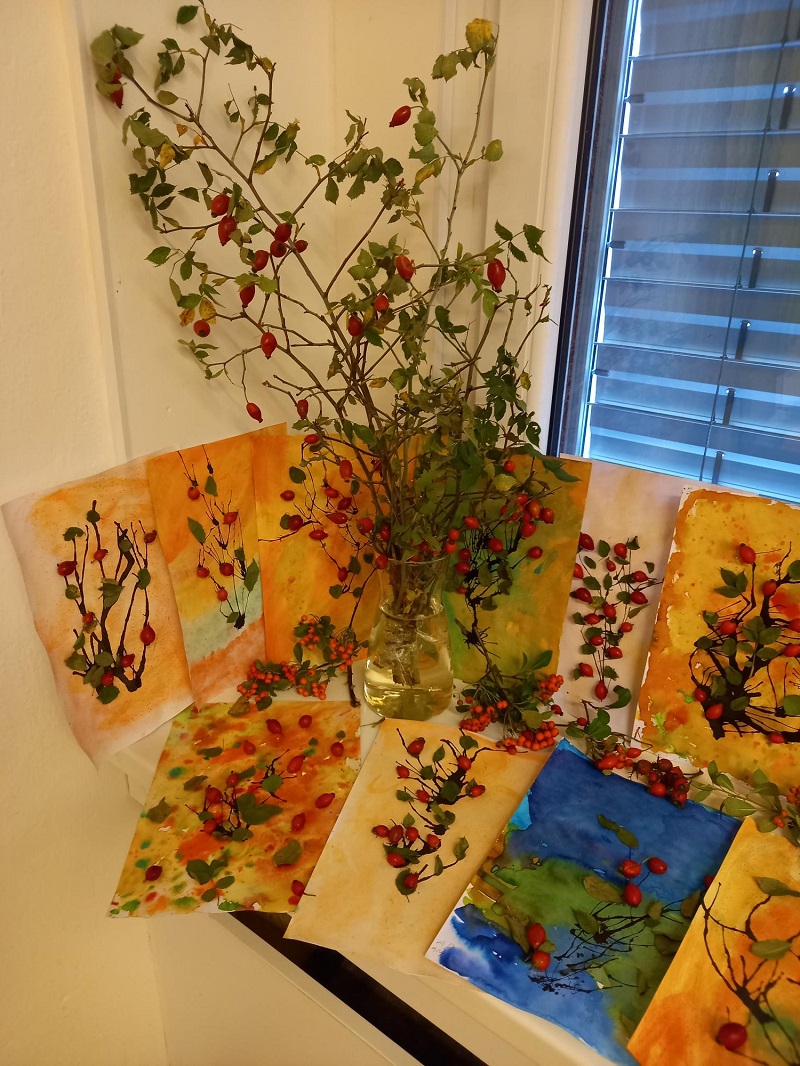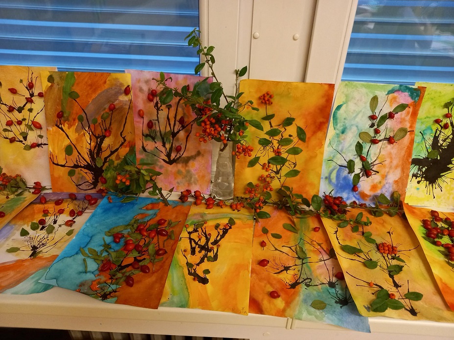 Nejprve si připravili pozadí, které hraje krásnými barvami podzimu. Poté pomocí brčka rozfoukávali tuš, která vytvořila zajímavé větvičky a struktury. Na tyto rozfoukané větvičky nalepovali šípky a jeřabiny.