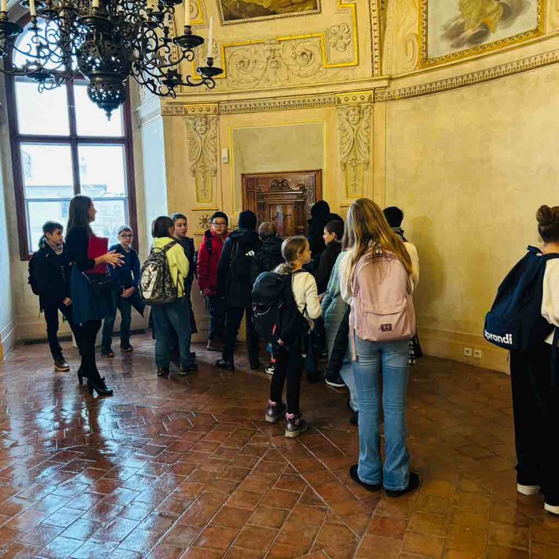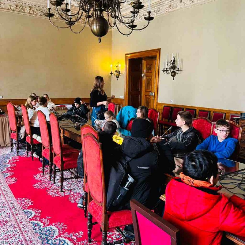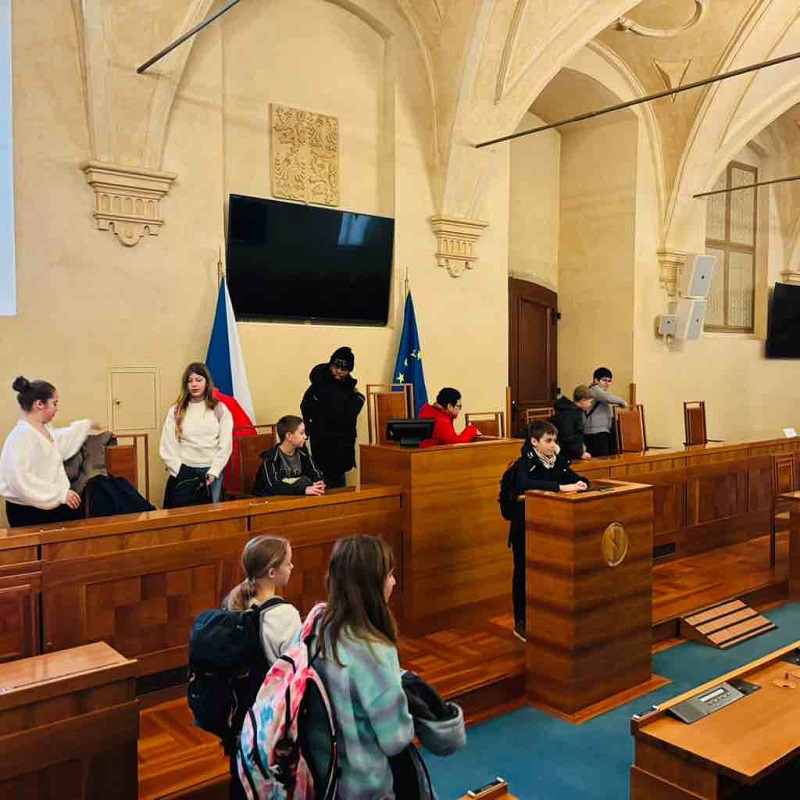 V Senátu se nás ujala paní Aneta Ženíšková, asistentka paní senátorky, která dětem poutavě přiblížila osobnost Albrechta z Valdštejna, provedla nás reprezentačními prostory a ukázala nám i jednací sál, kde dnes senátoři rozhodují o zákonech. Děti si zde mohly sednout přímo ke stolkům, kde běžně zasedají senátoři, a vyzkoušet si také místa předsedy Senátu, místopředsedů a dalších představitelů.